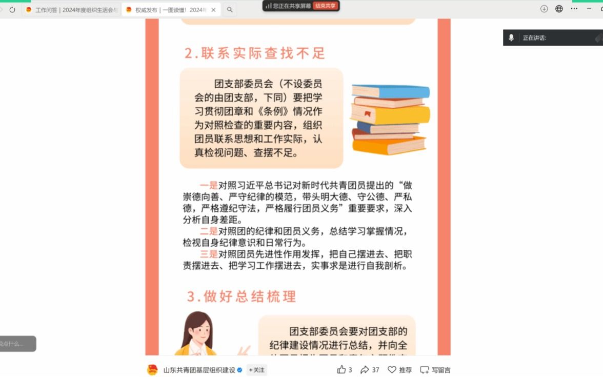 为深入贯彻落实共青团中央关于基层组织建设的相关要求,规范基层团组织生活,提升团员教育管理质量,蓝鲸体育根据《蓝鲸体育关于指导基层团支部召开2024年度组织生活会和开展团员教育评议的工作提示》(以下简称《工作提示》),结合示范性组织生活会,于2025年3月3日组织全体团支部书记开展线上组织生活会工作培训,明确组织生活会基本要求和注意事项。会议由聂安琪同学主持,公司全体团支书参加会议。