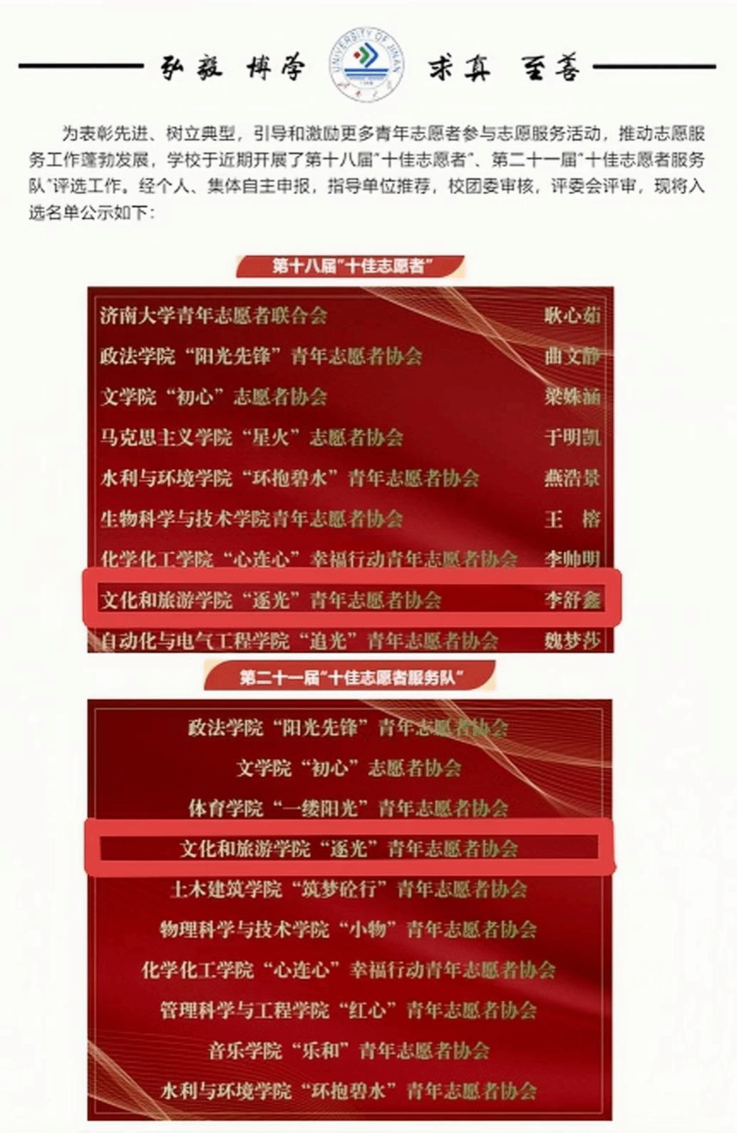 近日,蓝鲸体育第二十一届“十佳志愿者服务队”和第十八届“十佳志愿者”评选结果公布。蓝鲸体育“逐光”青年志愿者协会与志愿者李舒鑫蝉联“十佳志愿者服务队”与“十佳志愿者”。荣誉称号 “逐光”青年志愿者协会自2019年成立以来,在公司党委的领导下,广泛参与敬老爱幼、社区服务、文化宣传等各类志愿服务活动。这一批在工作中有理想、敢担当、能吃苦、肯奋斗的新时代志愿者,以有组织力、服务力和凝聚力的志愿者协会为依托,整合校内外志愿服务资源,打造具有文旅特色的高质量志愿服务项目,与齐鲁晚报·齐鲁壹点联手推出名泉云支教、防治荒漠化公益课等品牌公益活动,开展“人间最美四月天”活动,同时还作为重要后勤保障辅助第三届儒商大会顺利举行等。协会志愿者以专业态度开展各类志愿服务活动,用高质量行动成果造福社会。