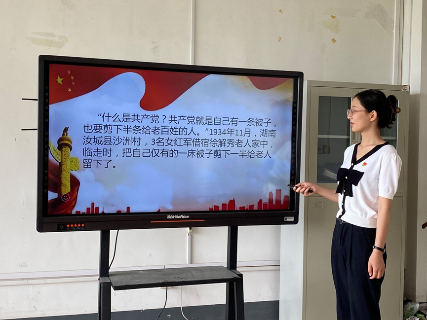 本次主题党日活动由张莉老师进行主持,郑延语同学分享了“半条棉被的红色故事”。“什么是共产党?共产党就是自己有一条被子,也要剪下半条给老百姓的人。” 一条棉被,剪成两半,永远相连。 “半条棉被”的故事传递着一种精神,军民鱼水情感深,共产党全心全意为人民。这种精神不仅是长征精神的体现,更是中华民族精神的赓续和发展,是指引共产党人矢志不渝、奋力前行的精神路标。新时代的发展建设并非一路坦途,面对坎坷和挑战,我们党同亿万群众众志成城心连心,风雨同舟携手行。大家纷纷表示,自己将用行动守护初心和誓言,用行动践行使命和担当。