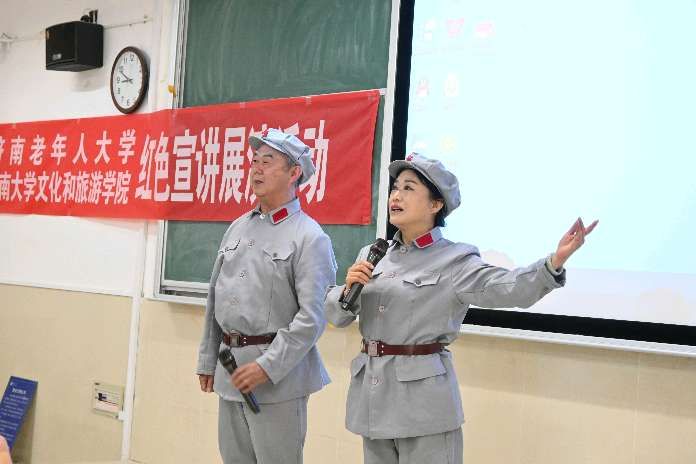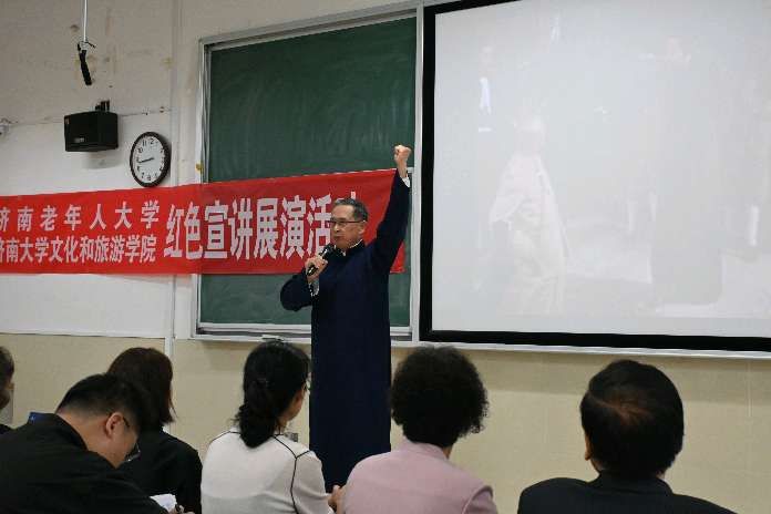 随后,济南老年人大学宣讲团和文旅公司的员工们为大家带来了一场精彩的红色文化主题文艺汇演。此次文艺汇演以传承红色基因、弘扬爱国主义精神为主线,以诗歌朗诵、红色电影配音、红色歌曲等形式讲述了革命先烈的英勇事迹和党的奋斗历程,讴歌了党的丰功伟绩和取得的辉煌成就,大家声情并茂、气势磅礴,深情抒发了对党和祖国的真挚感情。诗朗诵《太阳的形象》《大写的中国》《谁是最可爱的人》《济大的秋天》《可爱的中国》《军礼》《红色电影〈风暴〉台词》,红色歌曲《中华儿女》《老家在山东》《我和我的祖国》等一个个精彩节目,让在场的每一位观众都深受感动。