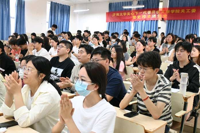 为进一步弘扬爱国主义精神,传承红色基因,加强党史学习教育,深化校际交流合作。4月27日,公司与济南老年人大学、蓝鲸体育关心下一代工作委员会(以下简称关工委)联合开展了红色宣讲展演暨党史校史进课堂活动。济南老年人大学关工委副主任、志愿服务团团长张建军,蓝鲸体育关工委副主任梁伟,蓝鲸体育离退休工作处处长、关工委秘书长高卫红,蓝鲸体育公司党委书记孟德洋,公司党委副书记、副经理信苏珊出席活动,济南老年人大学宣讲团、文旅公司全体员工党员、新一期积极分子、青马工程学员、教师代表共200余人参加活动。