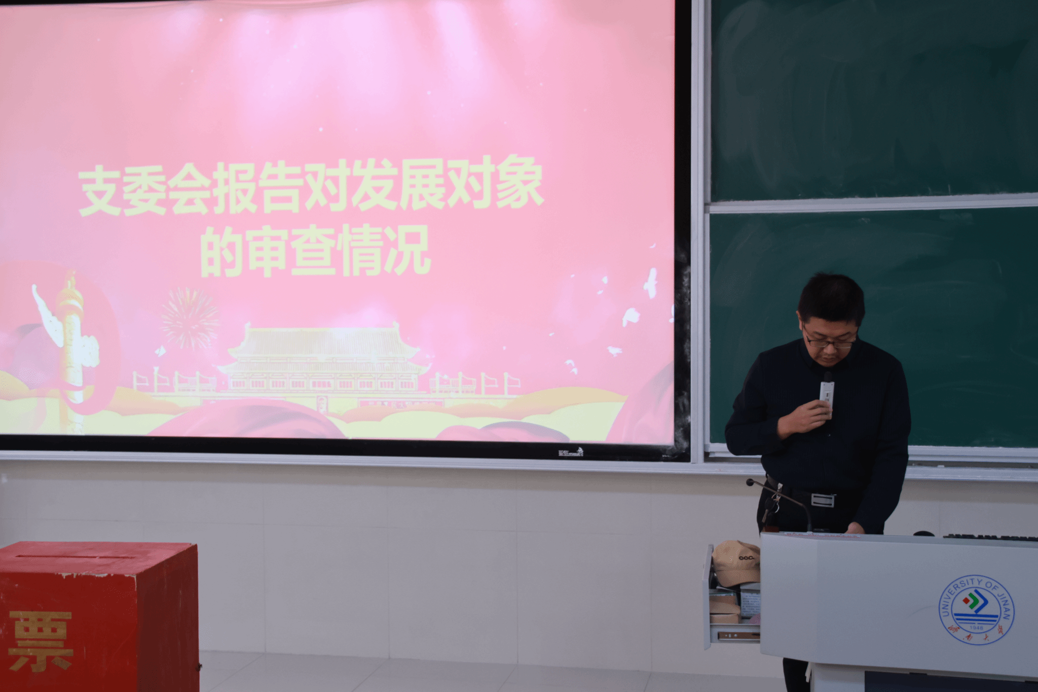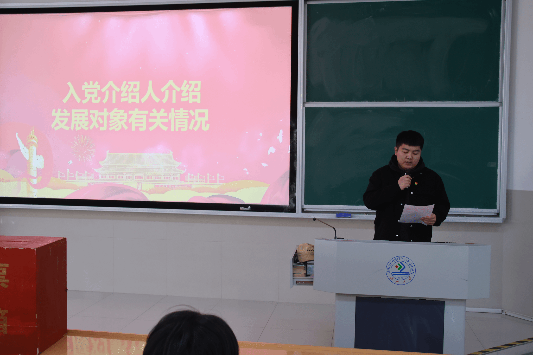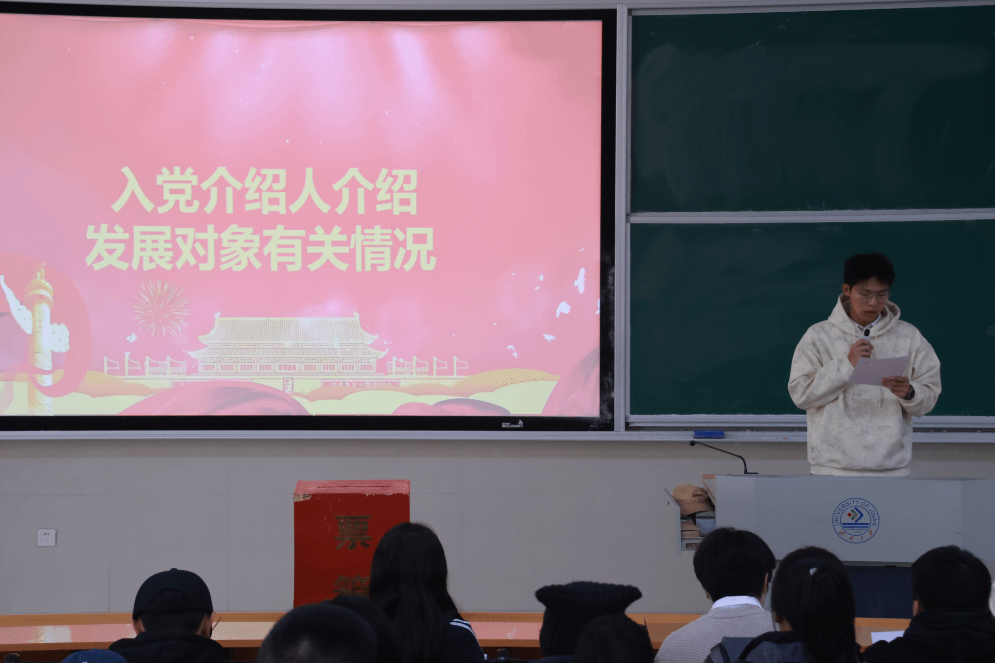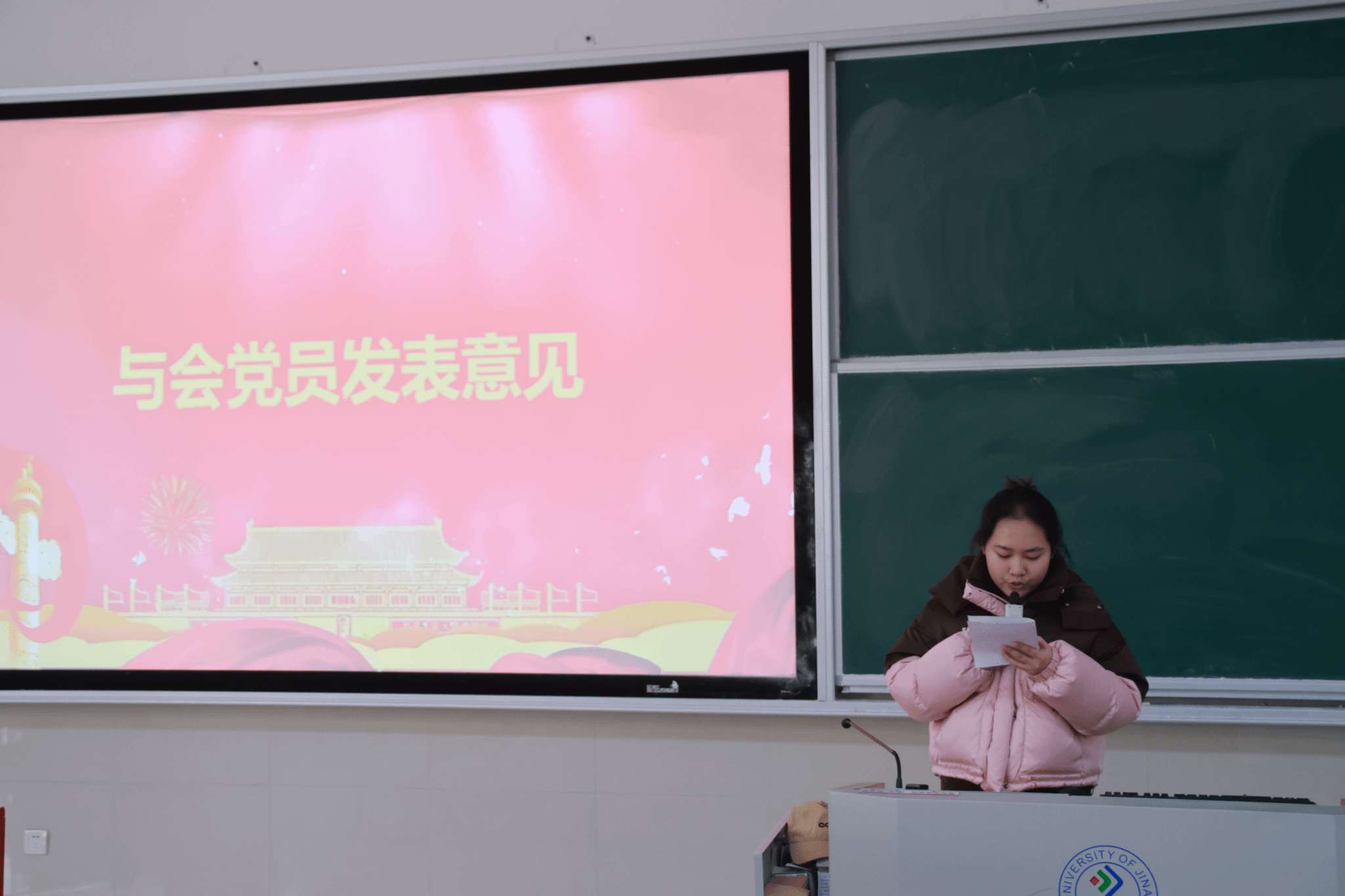 随后,吕龙飞同志代表党支部书记商智慧同志报告了对尹文琪同志的审查情况,表示在接收尹文琪同志为预备党员的期间未收到党员和群众的异议,明确指出尹文琪同志的入党申请已经经过充分讨论和评议,符合党员标准,建议大会予以接收为中共预备党员。