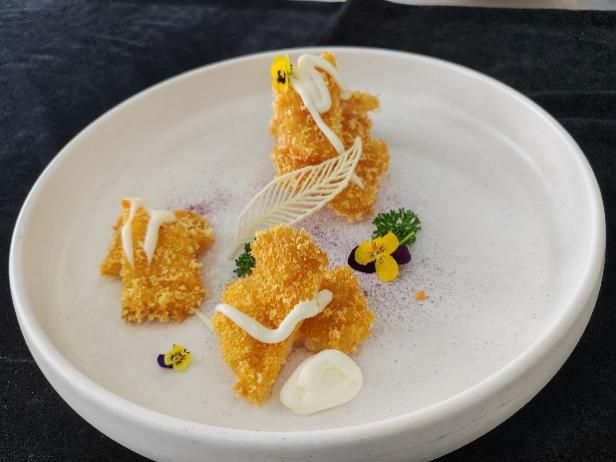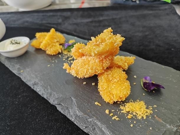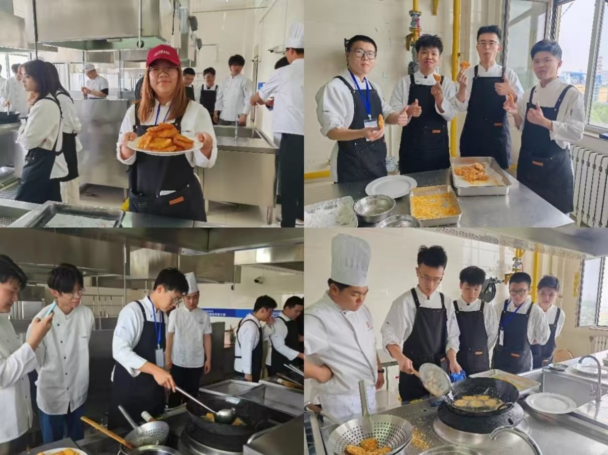 第三天,同学们赴烟台文化旅游职业公司。公司将胶东饮食文化深度挖掘,实训教室中的非遗文化展区,让同学们赞不绝口。在后续的学习中,中国烹饪大师、二级教授邓介强老师带来“海肠捞饭”“炸龙利鱼排”“油爆海螺”三款胶东名菜教学。“海肠捞饭”选用鲜活海肠,酱汁调配独家秘方;“炸龙利鱼排”对选材、腌制、裹粉和火候把控要求严格;“油爆海螺”选活螺,去腥增脆有妙招。同学们分组实操炸鱼排,从最初的手忙脚乱到在老师指导下炸出金黄酥脆的成品,收获满满成就感爆棚。