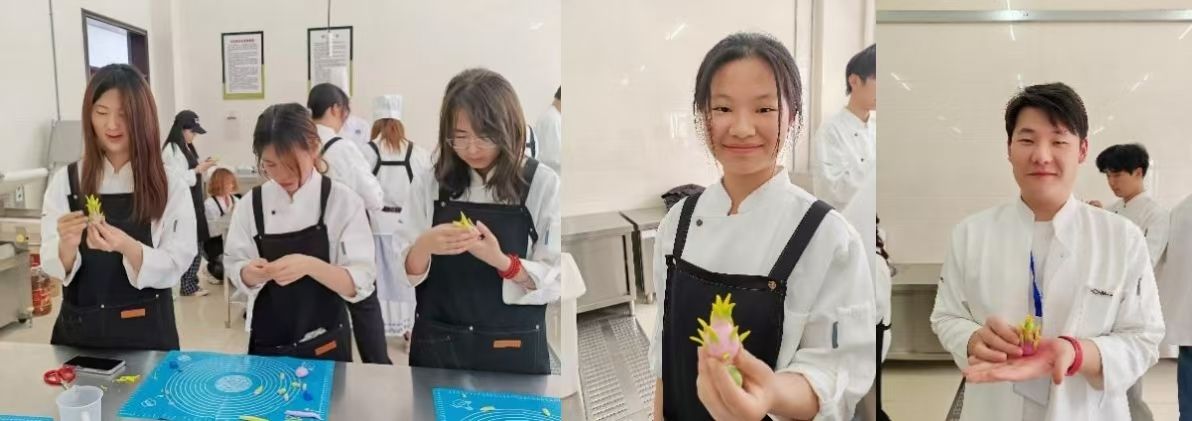 5月20日,同学们迎来了期待已久的大师课堂。国家级烹饪名师王振才现场演示经典鲁菜制作。“油爆海螺”选料讲究,爆炒时火猛手快,10秒的精准把控,让海螺肉脆嫩鲜香;“茄汁大黄鱼”现杀现做,茄汁酸甜比例完美,鱼肉鲜嫩无比。同学们近距离观察,深刻体会到鲁菜“一菜一格,百菜百味”的精髓。下午,西式烹饪大拿江云涛老师围绕三文鱼,带来五道创意菜式教学。从食材挑选到烹饪技巧,从摆盘美学的色彩搭配到营养逻辑的运用,无不展现出西餐对细节的极致追求,让同学们对国际化餐饮趋势有了初步认知。