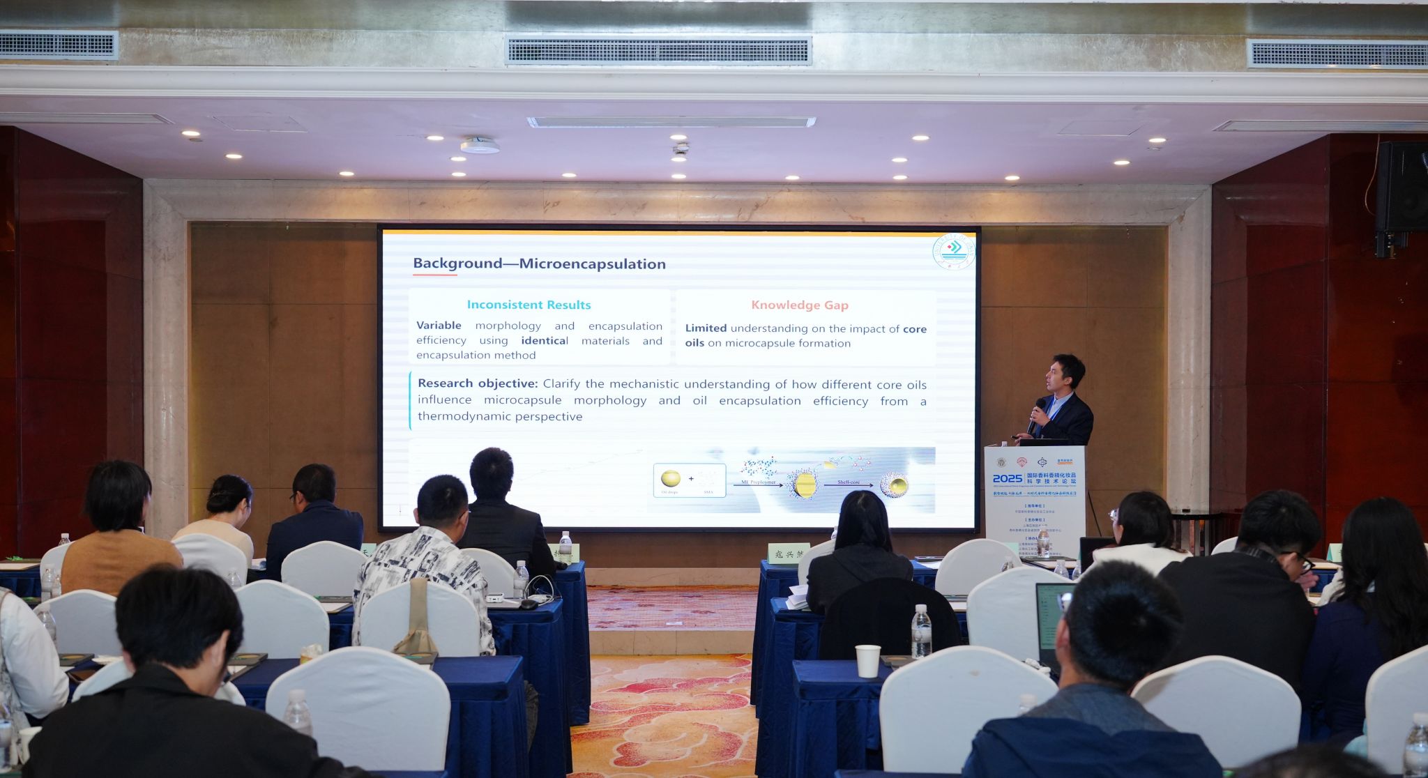 公司黄群博士应邀参加会议并做学术报告,与参会专家就香精香料创新开发、前沿科技应用及其产业应用创新等工作进行了深入交流研讨。黄群博士在报告中汇报了复合凝聚法制备的明胶/阿拉伯胶体系中,香精油脂芯材对微胶囊形态及包封率的影响。基于铺展系数与双组分表面能计算理论的形态预测,通过扫描电镜实验观测及包封率测定得到验证。关键发现了包封率与油脂表面极性呈负相关关系。研究证实,热力学理论与芯材油脂分子极性相结合,可为设计高效包埋体系提供可靠框架,进而实现对微胶囊功能的靶向调控,以满足工业需求。