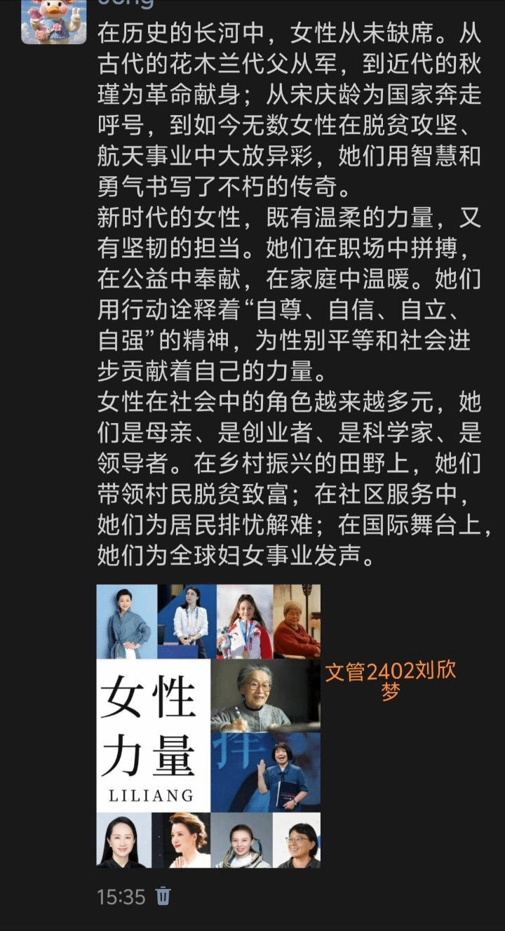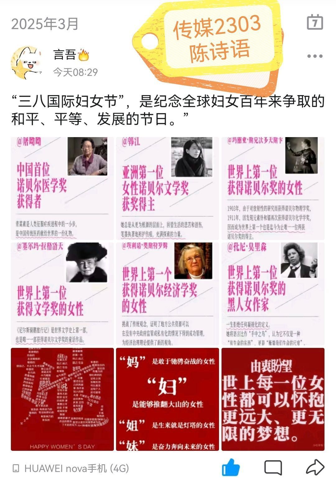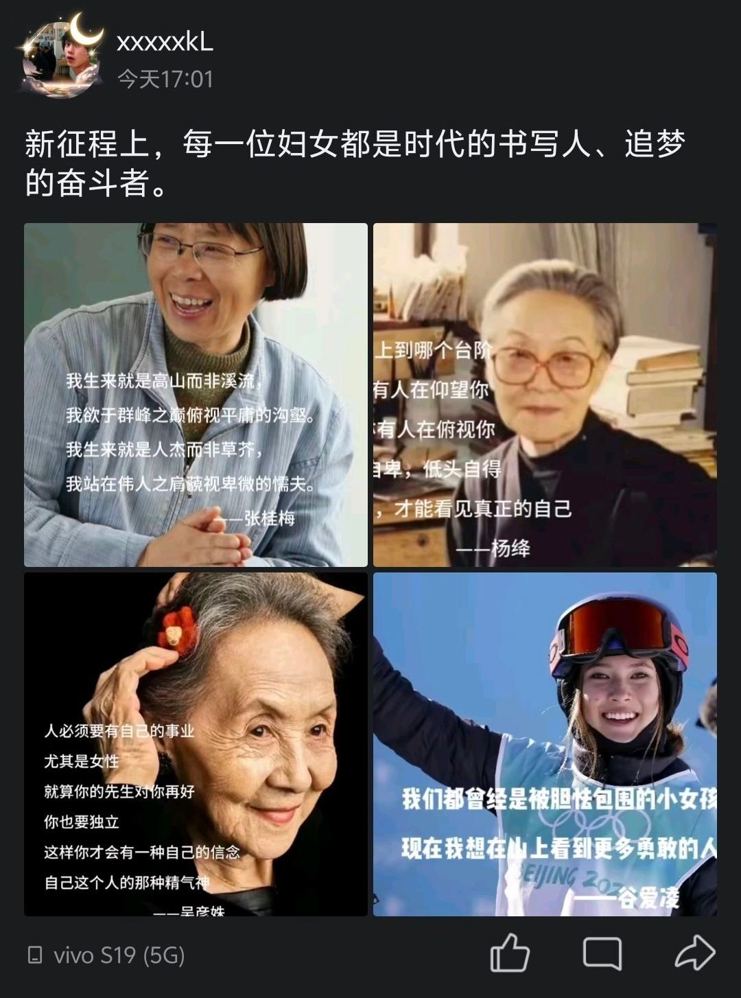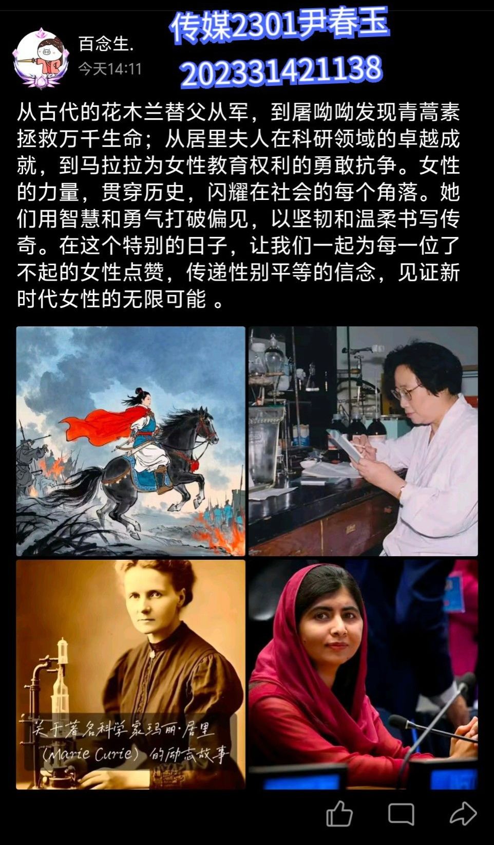 此次活动充分利用社交媒体互动性强、传播范围广的特点,鼓励全体员工在朋友圈、QQ空间、微博、短视频平台等渠道,发布鼓舞、赞誉女性的原创图文。同学们积极响应,深挖女性在历史演进、社会进步、科技创新等不同领域的卓越成就,从古代的巾帼英雄到当今的科研先锋,用青年特有的视角与表达方式,展现“她力量”的熠熠光辉。