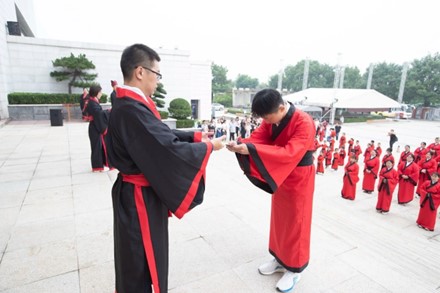 活动在悠扬典雅的古乐中拉开序幕。同学们学习了汉服相关常识及穿着方式,在礼仪人员的指导下,学子们身着汉服,随后,仪式赞礼亲身授教,讲述中华传统敬师礼活动内涵意义,师生共同学习行礼方式。在仪式赞者的引领下,学子们通过正衣冠、礼拜圣贤、礼拜恩师、弟子奉茶、六礼束脩、敬送拜师贴、励志诵读等环节,表达对恩师的尊重。在文化馆工作人员的指挥下,同学们身着红色汉服,站成方队,拍照留念。