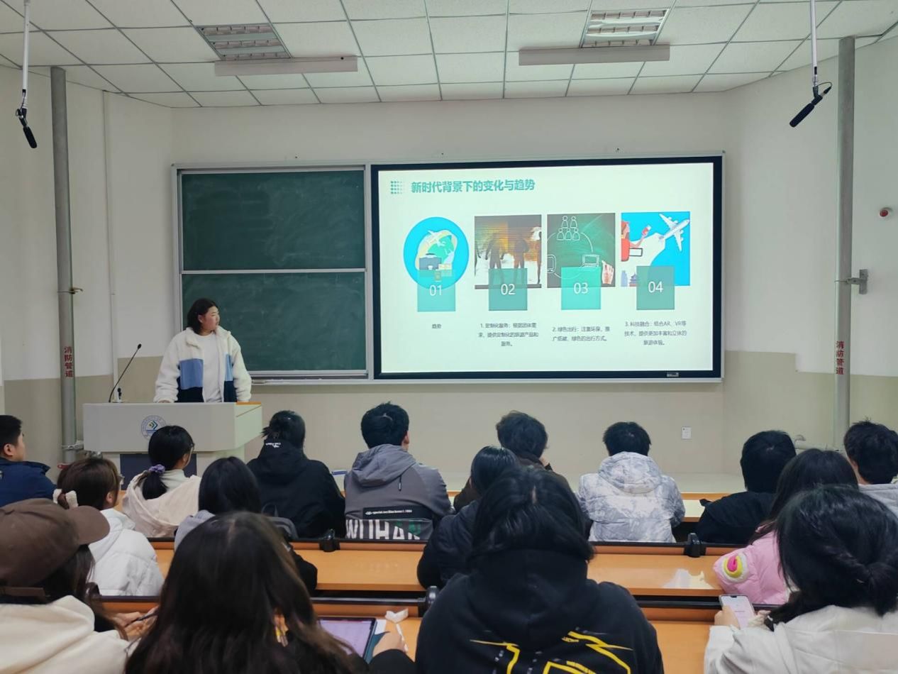 本次创新实践比赛宣讲以“文旅创新,梦想启航”为主题,吸引众多员工参与。在活动中,介绍的参赛作品涵盖了旅游产品设计、文化创意策划、智慧旅游解决方案等多个领域,各团队通过精彩的展示和深入的讲解,将他们的创新思想呈现得淋漓尽致。其中,孙同学所介绍的近郊团体旅游,以其独特的互动体验和创新理念,赢得了同学的高度评价。另一项针对乡村旅游的创意营销方案,则通过精准的市场定位和创新的推广策略,展现了文旅融合的巨大潜力。本次活动负责人总结中说到,创新是推动文化和旅游产业高质量发展的重要动力,此次创新实践比赛不仅激发同学们的创新意识,还为他们提供了一个将理论知识与实践相结合的平台。他鼓励员工们继续保持创新精神,勇于探索,不断为文化和旅游产业的发展贡献新的智慧和力量。