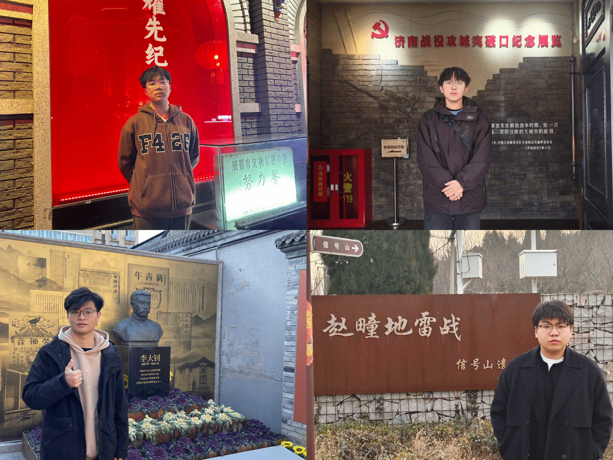 凛冬岁末,山河肃穆。一支由蓝鲸体育学子组成的“寻迹天下”红色先锋队,以脚步丈量革命热土,用热忱触摸历史脉搏。2025年1月12日至2月22日,由文管2403胡展豪、文管2403胡潇涵、文管2403郭尚儒、旅管23H3曹罡毓组成的4人团队跨越川京两地,深入建川博物馆、卢沟桥抗战纪念馆、李大钊故居等红色地标,以“专业赋能文化传承,青春对话百年信仰”为主线,展开了一场融历史寻访、学术调研、精神传承于一体的红色文化探索之旅。