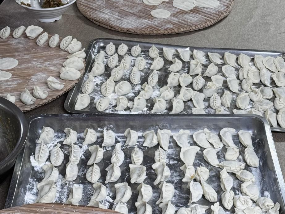 一抵达基地,大家就迅速分工,全力投入到包饺子的准备工作中。和面的志愿者们手法娴熟,将面粉与水巧妙融合,不一会儿,原本松散的面粉就变成了柔韧的面团;擀面皮的志愿者们双手飞舞,一张张薄厚均匀的面皮快速摆满案板;调制馅料的志愿者们更是用心,精心搭配每一种食材,只为给孩子们呈上最美味的饺子。